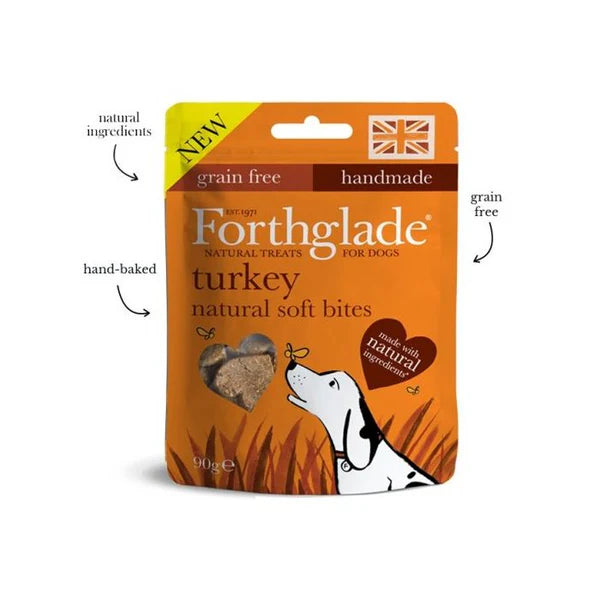Forthglade's tasty turkey soft bite treats are hand-baked, grain-free and made with only natural ingredients. Free from artificial flavours, junk, or fillers, these soft treats will be flavour favourites for your four-legged friend.